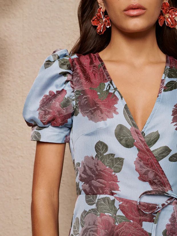 Wrap style and floral jacquard hold sunshine in every fold. Adjustable ties make light yours to wear. Fully lined for twirling through honey-coloured streets.