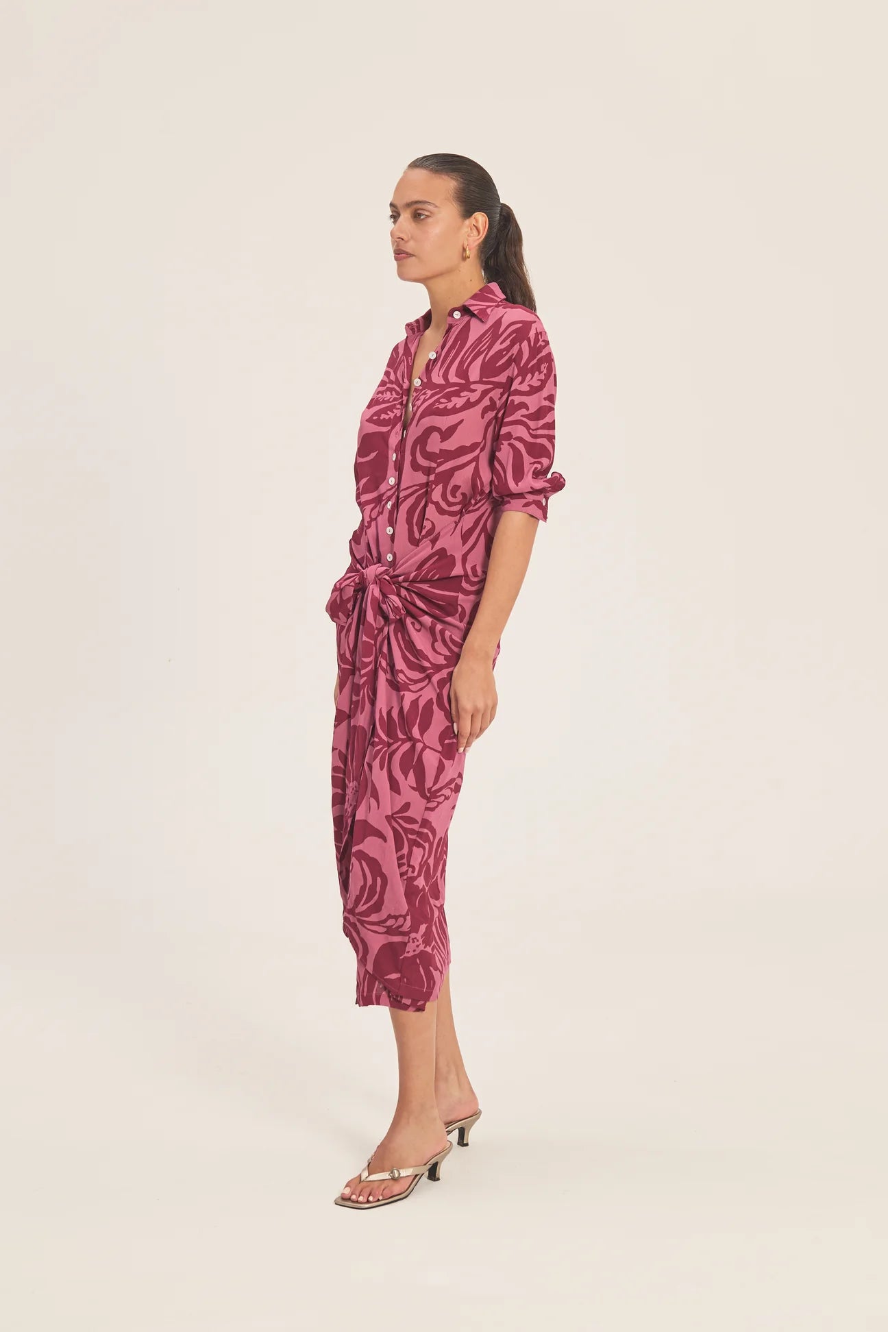 The Hailey Dress is a refined midi silhouette that balances structure with fluid movement. A classic collar and full button-down front create timeless polish, while the adjustable waist tie softly defines the shape. Falling into a gentle A-line skirt, it offers ease through the body with graceful movement at every step.