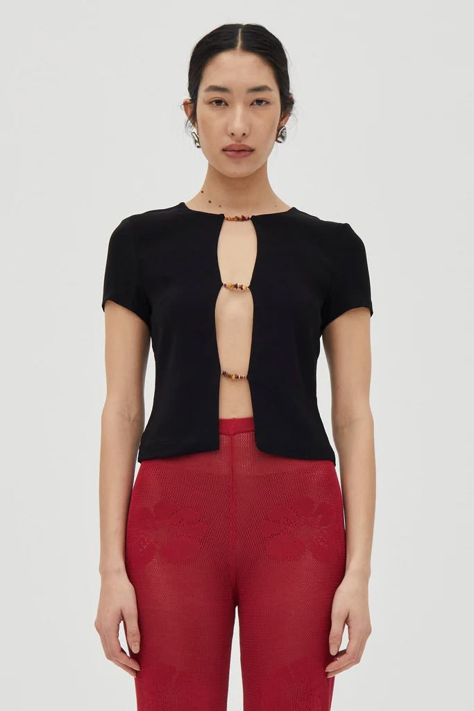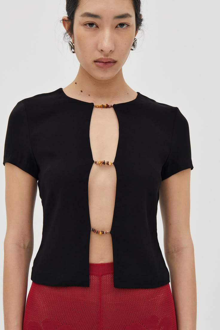 The Lucent Jewel Tee is cut to a slim silhouette with short sleeves and a high-hip length. Delicate beaded stone detailing through the front adds a subtle point of interest, keeping the look pared back yet considered.