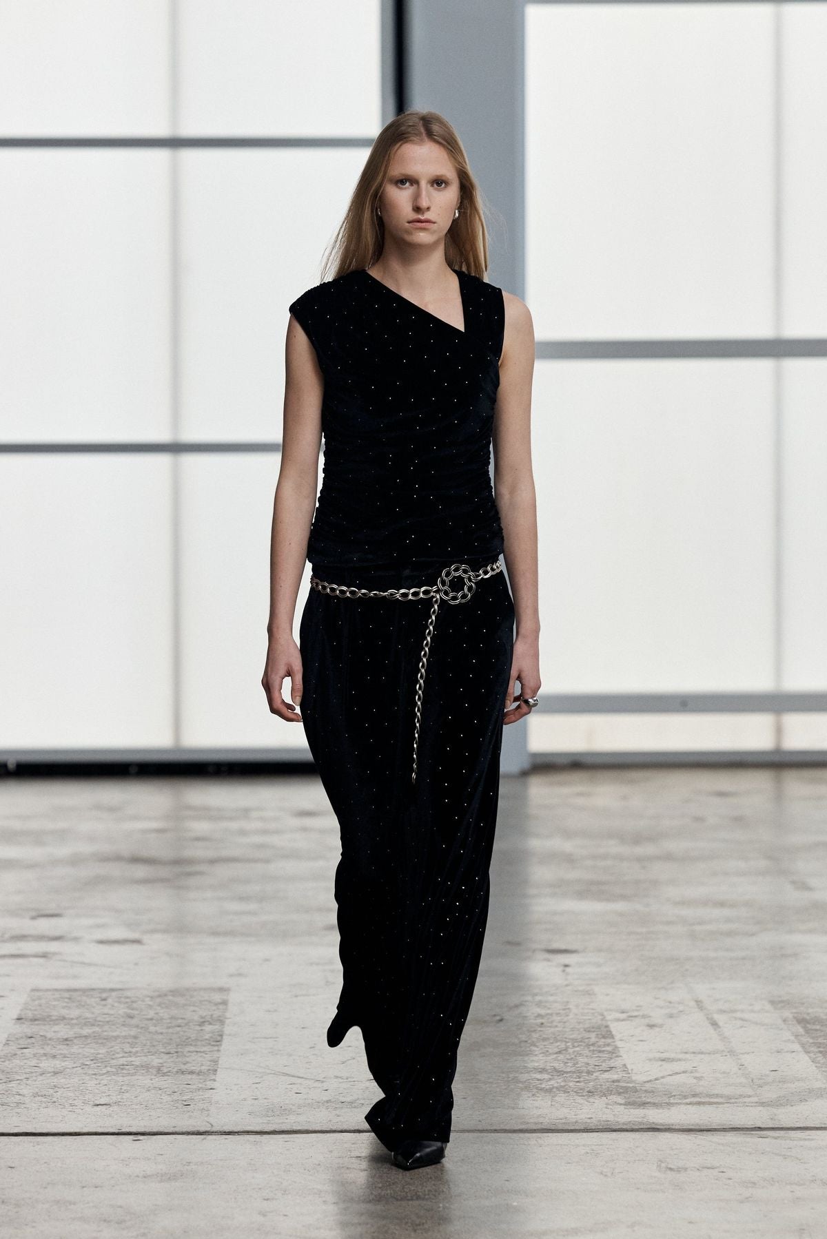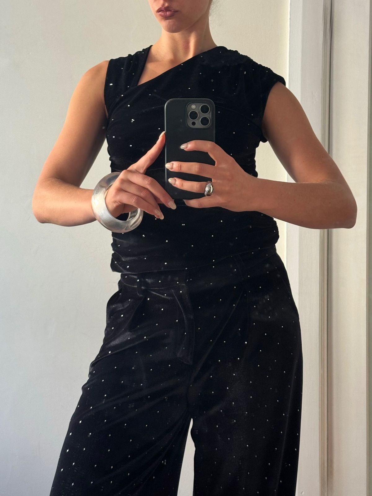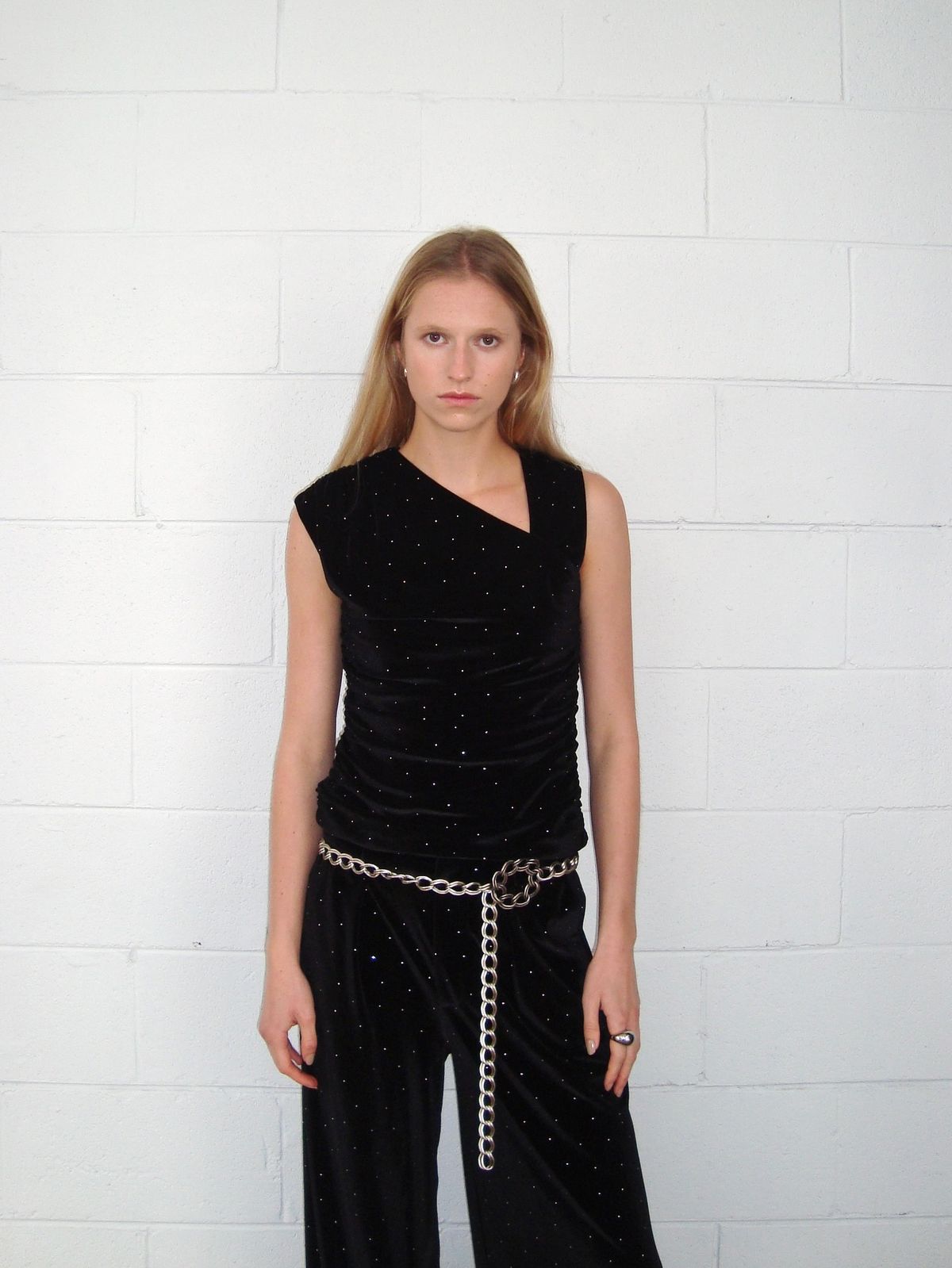 The Spark Ruched Tank is cut from crystal-embellished velvet, bringing texture and light to a fitted silhouette. An asymmetric neckline and gathered seams contour the body, while a concealed side zip ensures a smooth finish.