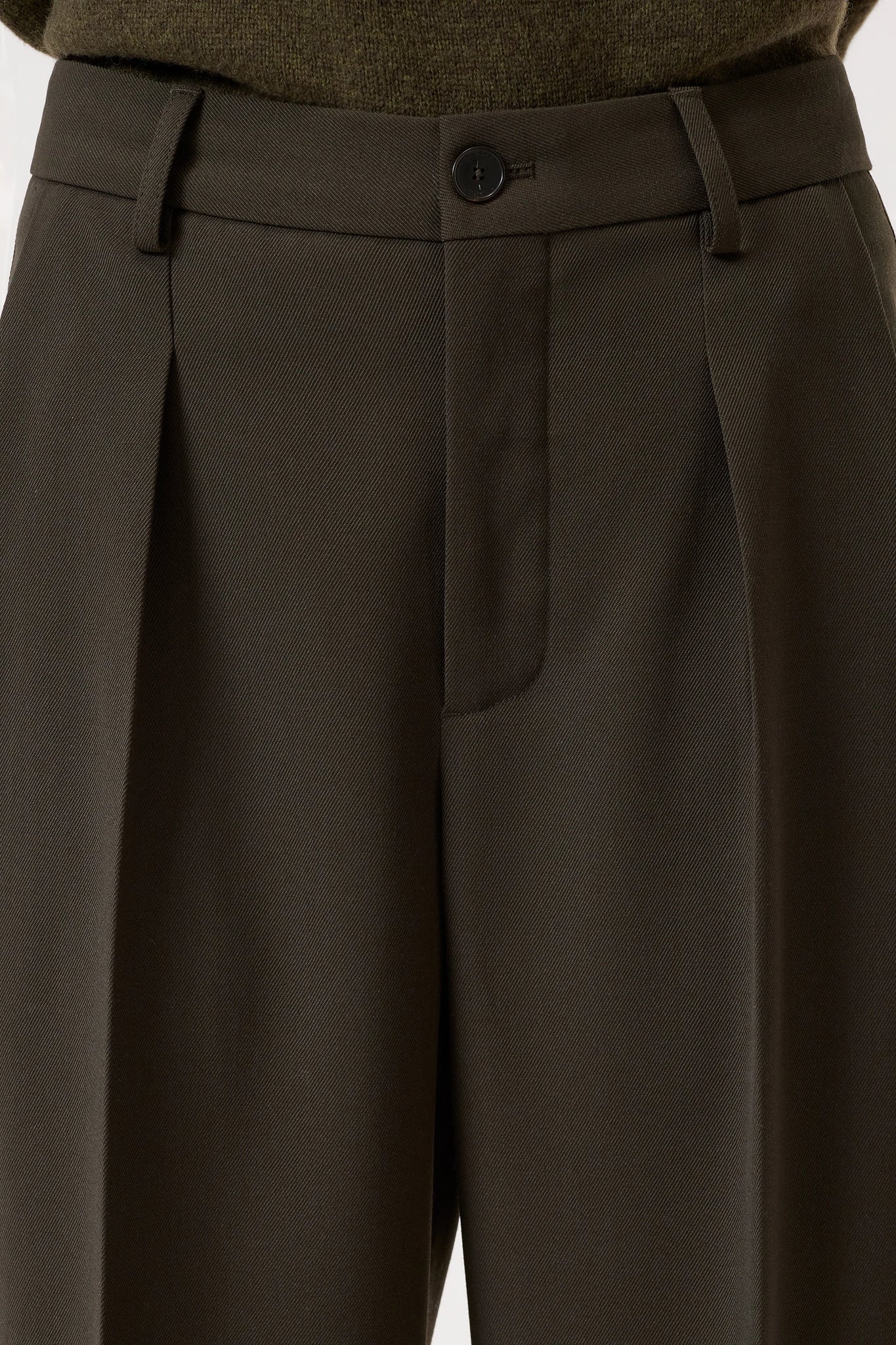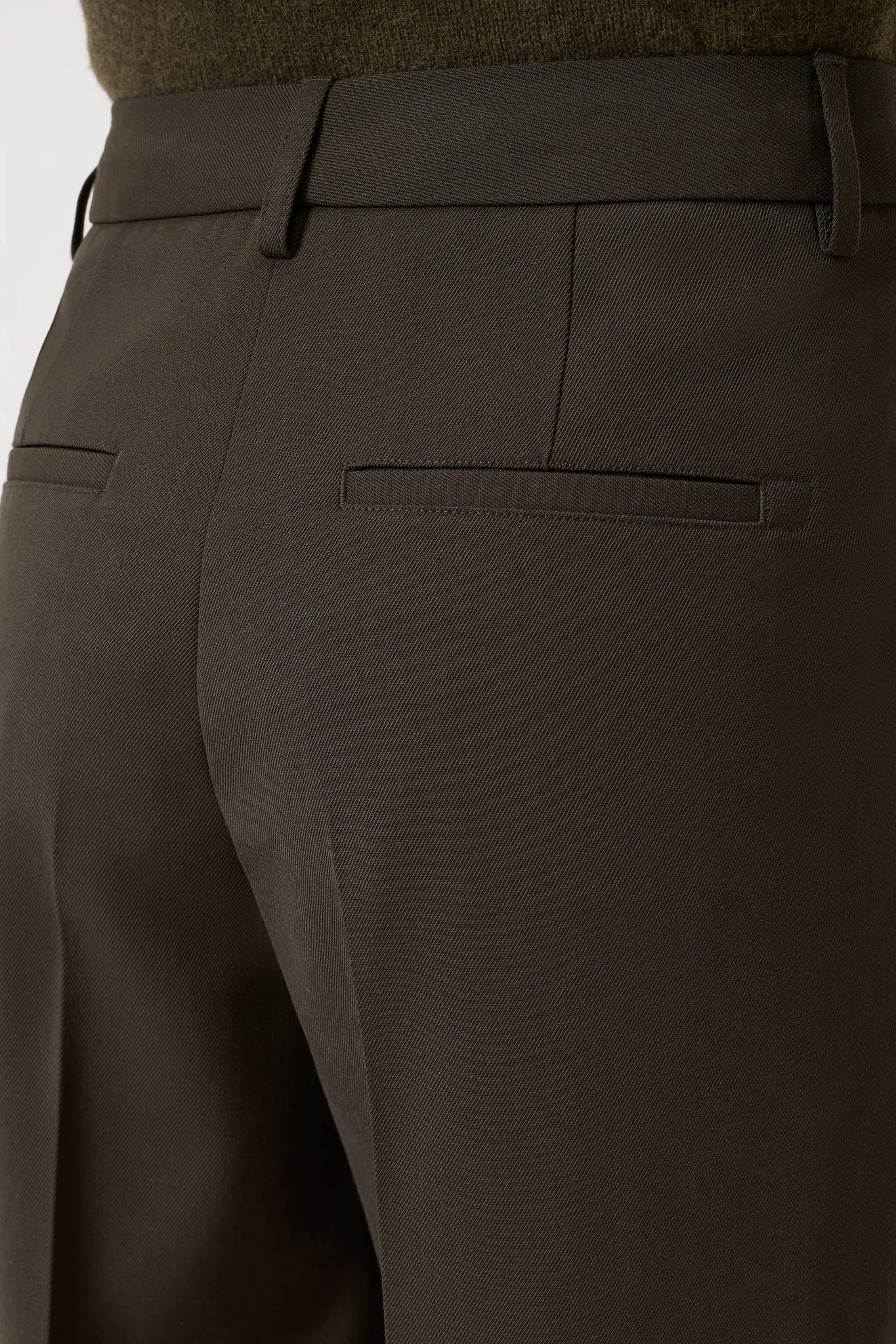 Our new relaxed fit pants Ruthy come with a wide leg and mid-rise waist. They are made from soft stretch-wool-blend twill with a vibrant piece-dye finish. Featuring front pleats, press creases in the front and back, and back welt pockets. Can be worn as a complete suit with the matching blazer. Made in Romania.